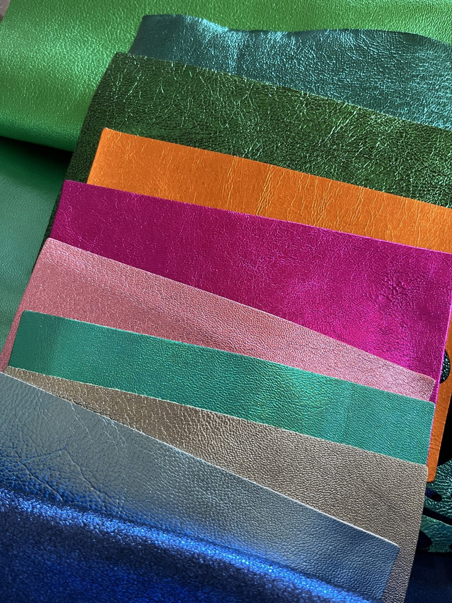 Mais ma démarche éco-responsable va au-delà du choix des cuirs. Certaines de mes créations intègrent des cuirs pailletés que je confectionne artisanalement dans mon atelier, en utilisant exclusivement des paillettes écologiques, respectueuses de l'environnement.